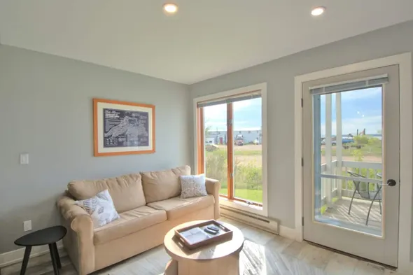 Queen suite with jacuzzi tub and shared patio space in downtown Bayfield, close to Lake Superior and local attractions.