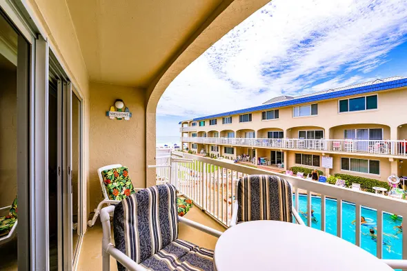 Back patio overlooking community pool and walk to the beach