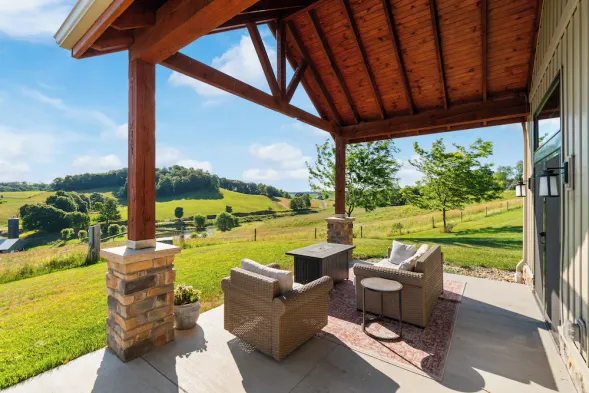 Relax in a fully furnished vacation home with a hot tub, game room, and stunning views in Sugarcreek, Ohio.