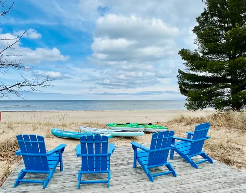 Beach cottage with private beach access, free self-parking, and outdoor amenities in Oscoda, Michigan.