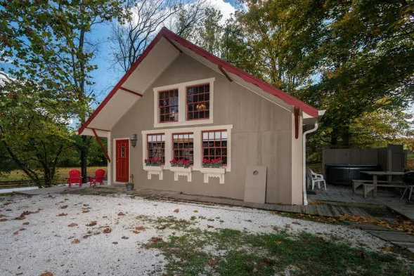 Cozy cabin suite with air conditioning, shared sauna, and outdoor deck in scenic Brown County, Indiana
