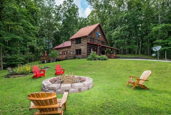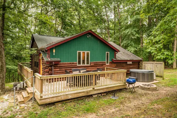 Cozy cabin with a fireplace, large deck, hot tub, and yard games on 6 acres in Brown County, perfect for a weekend getaway.