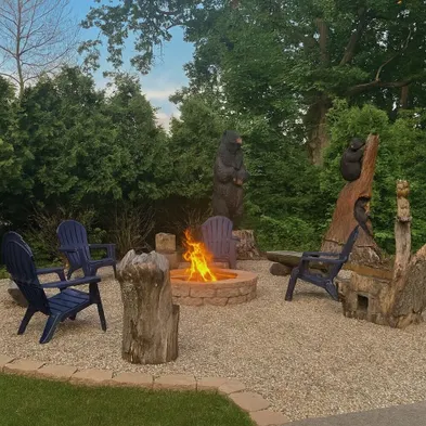 Sleek forest retreat: karaoke, spa, campfire, pool table, grill, outdoor games