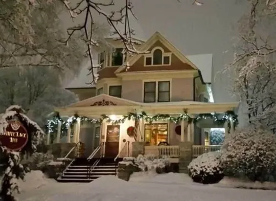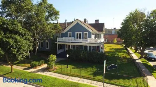 Victorian inn with complimentary breakfast, garden views, and arcade/game room in Sturgeon Bay's historical district.