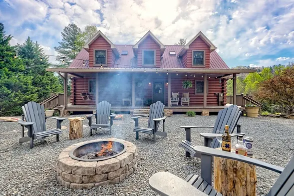 Modern cabin on the Tuckaseegee River with outdoor fire pit, full kitchen, and close to outdoor adventures in Bryson City.