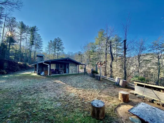Modern cabin on the Tuckaseegee River with outdoor fire pit, full kitchen, and close to outdoor adventures in Bryson City.