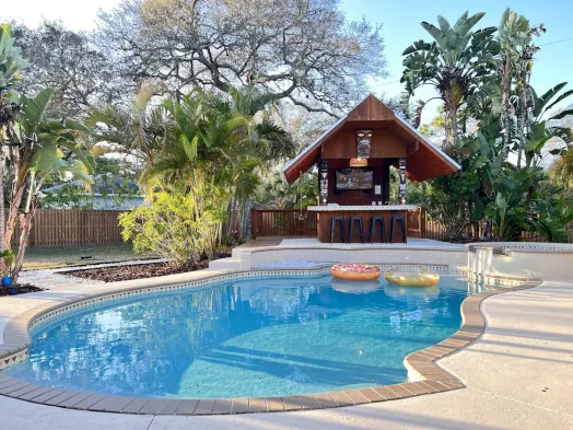 Tiki Oasis on 0.6 acres- 5 min to the beach, clean and modern.