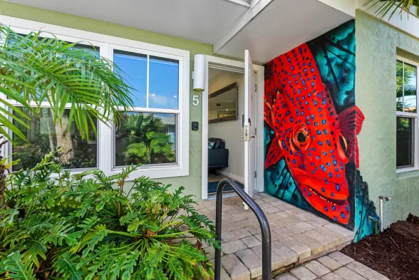 Relax in a resort with an outdoor pool, private beach access, and convenient grocery store in Nokomis, Florida.