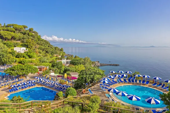 Luxury hotel with spa, multiple swimming pools, private beach, and gourmet dining in Lacco Ameno.