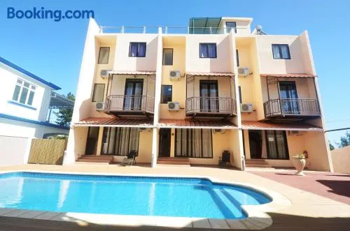 Furnished studio with swimming pool view, mini kitchen, and close to the beach in Flic-en-Flac, Mauritius.