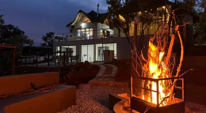 Relax in a lodge with a swimming pool, spa, and outdoor fireplace in Bela-Bela, South Africa.