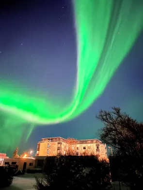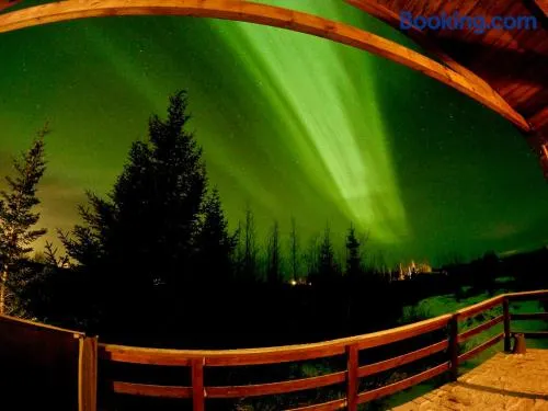 Relax in a countryside hotel featuring a rooftop restaurant, sauna, hot tub, and free self-parking in Bifrost, Iceland.