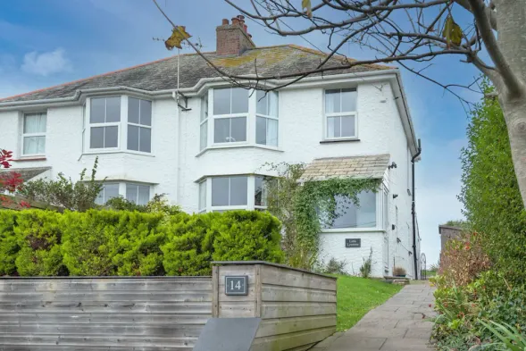 Pendragon House Overlooks Crooklets Beach in Bude with parking for 5 cars.