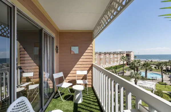 Enjoy a complimentary buffet breakfast and private balconies just steps from Seawall Beach in Galveston.
