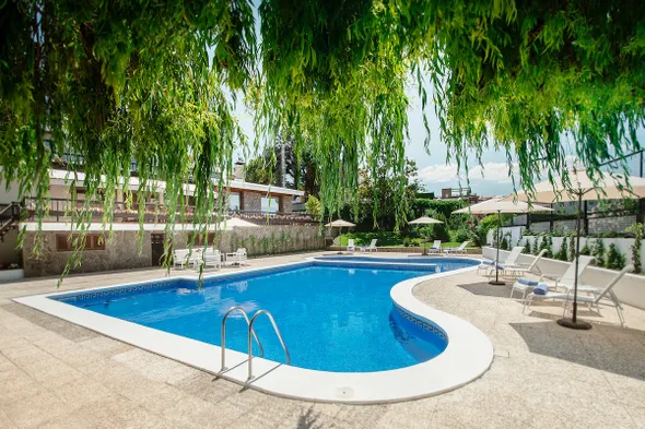 Spa hotel with swimming pool, restaurant, and beautiful countryside views, perfect for relaxation and wellness.