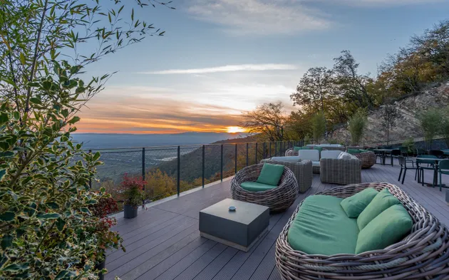 Luxury hotel with a full-service spa, seasonal outdoor pool, and two on-site restaurants in Kvareli Lake.