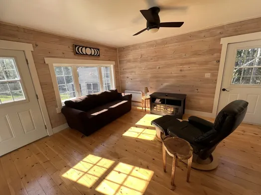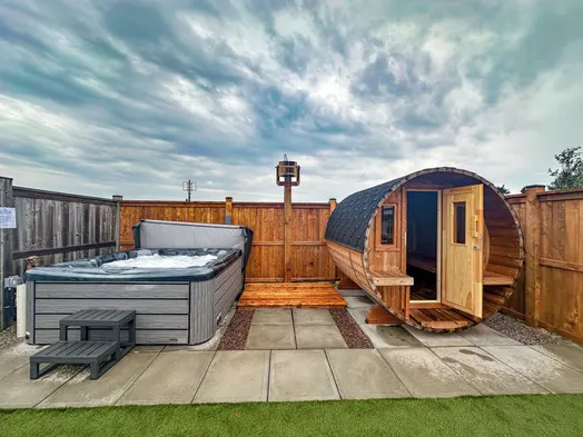 Cozy cabin with air conditioning, sauna, and a charming garden in the heart of Belfast's pastoral landscape.