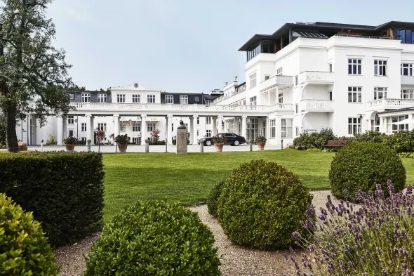 Luxury hotel with spa services, private beach, indoor pool, and ocean-view dining in Skodsborg.