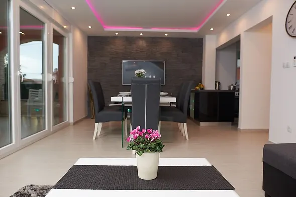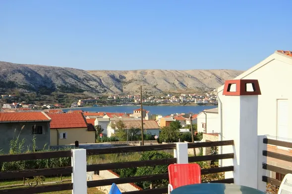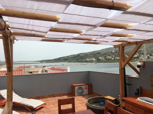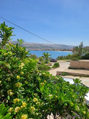 Relax in a sea-view apartment with outdoor pool, restaurant, and air conditioning just 100 metres from the beach in Pag.