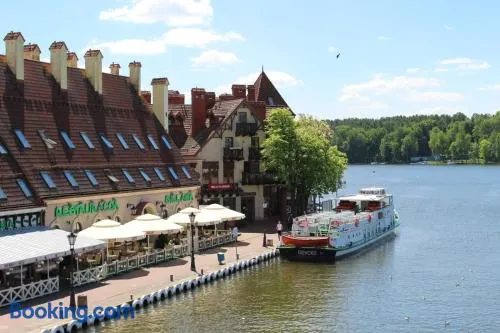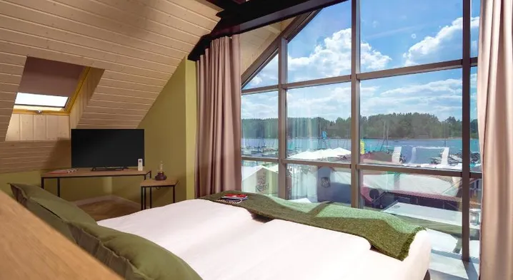 Luxury hotel on a lake with a spa, swimming pool, and two restaurants offering Polish cuisine. Enjoy stunning views and spacious rooms.