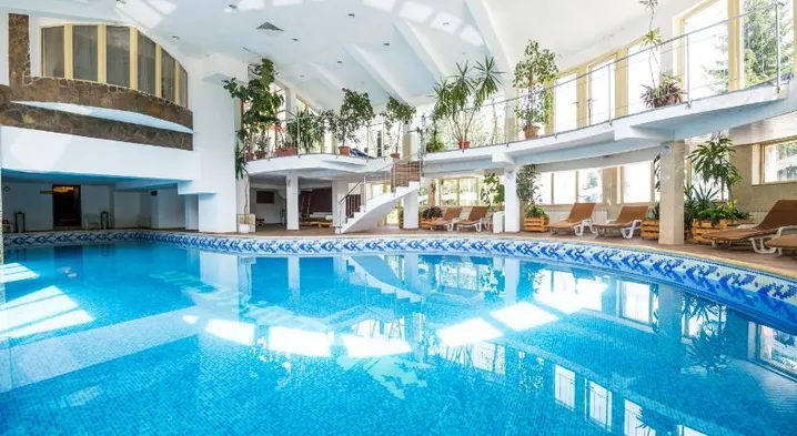 Luxury hotel with spa, indoor pool, and outdoor tennis courts near ski lifts in Pamporovo.