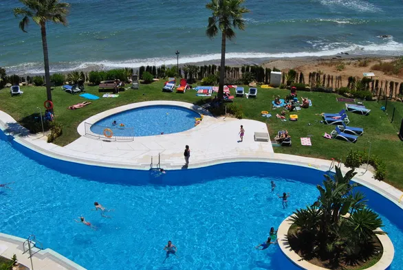 Mediterranean aparthotel with outdoor pool, tennis courts, and nearby golf course in Marbella's Elviria area.