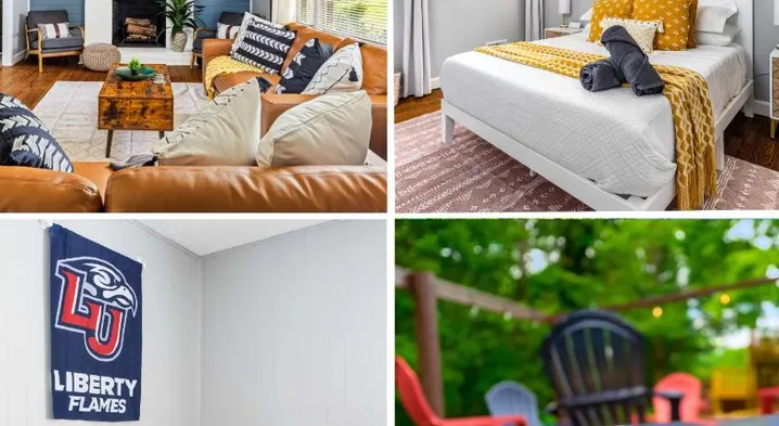 Relax in this charming cottage with a hot tub, oversized backyard, and modern farmhouse decor, perfect for remote work.