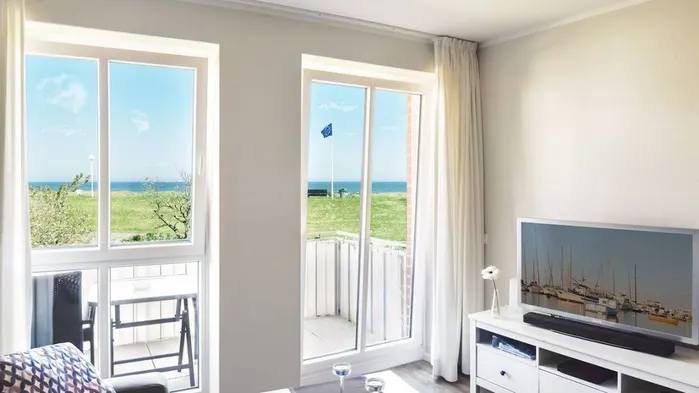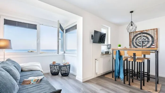 Modern seaside apartment with partial sea view and family-friendly amenities