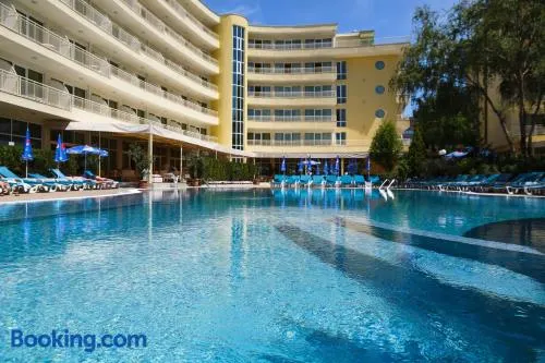 Family-friendly hotel with a seasonal outdoor pool and complimentary water park access in Nessebar.