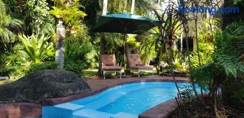 Experience comfort in St Lucia with an outdoor pool, air-conditioned rooms, and a poolside bar for relaxation.