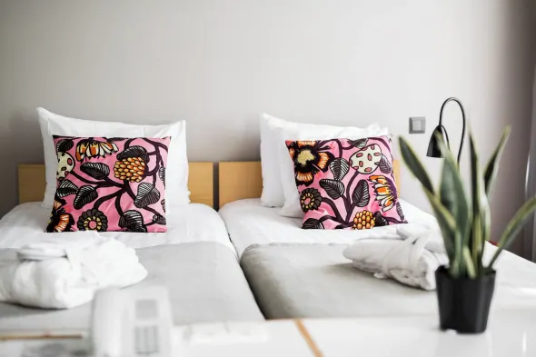 Centrally located hotel in Helsinki with individually decorated rooms and convenient amenities like free wifi and bike storage.