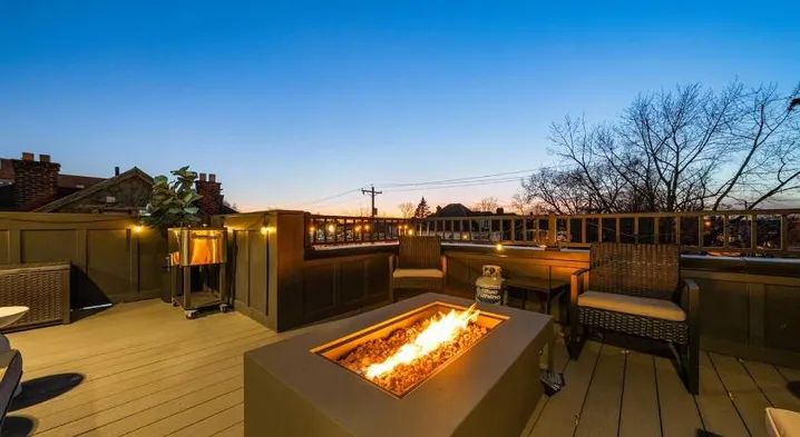Luxury homestay with a swimming pool, hot tub, and outdoor fireplace in Columbus, Ohio.