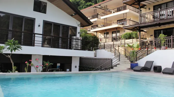 Beachfront resort with outdoor pool, restaurant, and air-conditioned rooms featuring private balconies in Anilao, Batangas.
