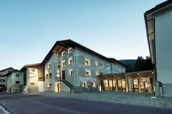 Luxury hotel with spa, outdoor pool, and five restaurants, steps from Engadin Valley and Signal Gondola in St. Moritz.