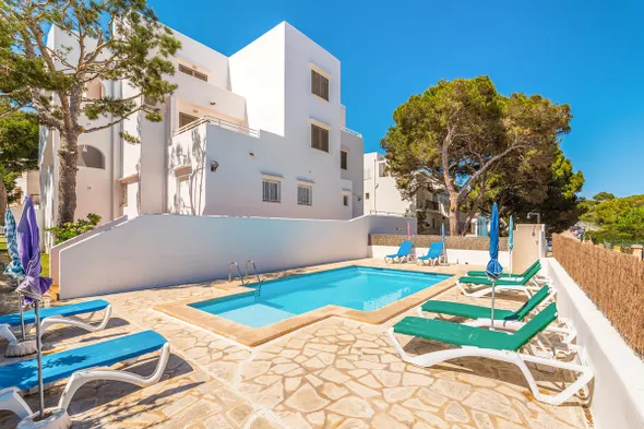 Attractive aparthotel with outdoor pool, sauna, and nearby beach access in Cala d'Or, Mallorca.
