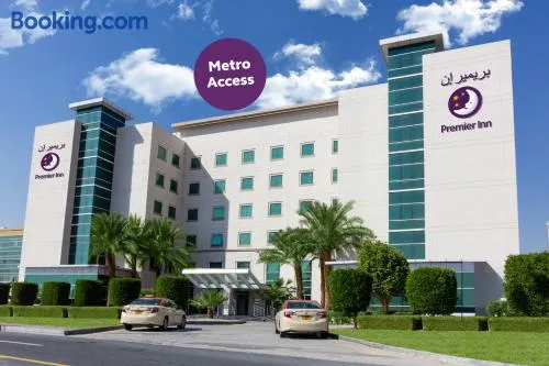 Modern hotel with a rooftop pool, gym, and on-site dining in Dubai Investment Park.