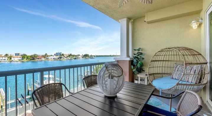 Luxury apartment with two bedrooms, swimming pool access, and a balcony for sunset views in Clearwater.