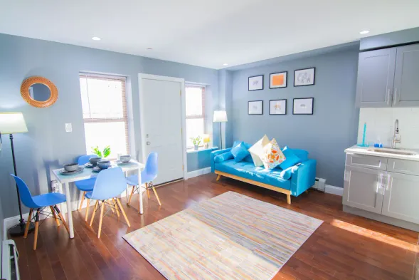 Recently renovated studio suite with stylish décor, 50-inch smart TV, and laundry service near UBS Arena.