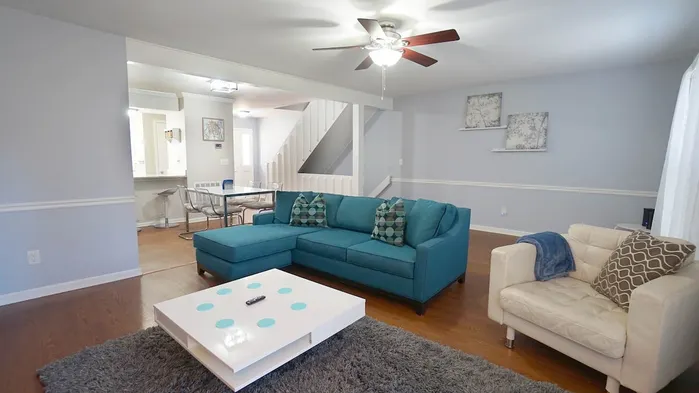 Eco-friendly apartment with a king-sized bed, game room, and disability-friendly access in Northwest Raleigh.