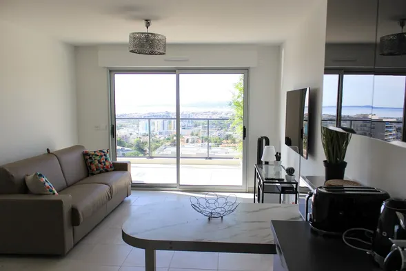 Modern apartment with a terrace, equipped kitchen, and free Wi-Fi, located near Plage de la Lanterne in Nice.