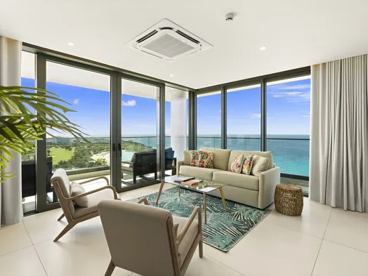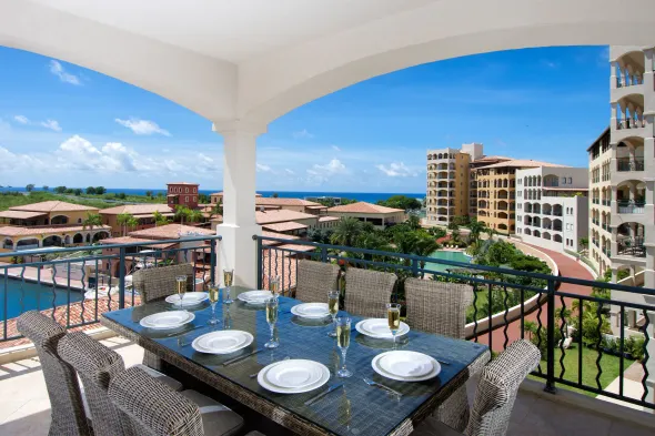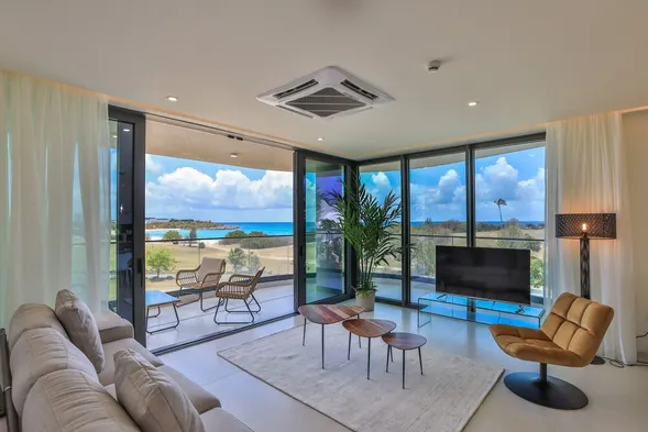 Upscale oceanfront condo with indoor and outdoor pools, tennis courts, and luxurious amenities in Cupecoy Beach.
