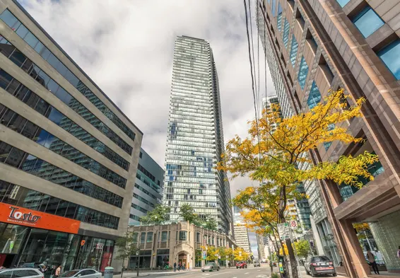 Modern apartment with skyline view, family room, express check-in/out, and outdoor furniture in Toronto's Bay Street Corridor.
