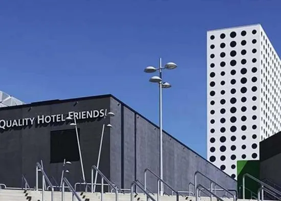 Modern hotel with stunning views, a gym, two saunas, and a top-floor restaurant near Friends Arena in Solna.