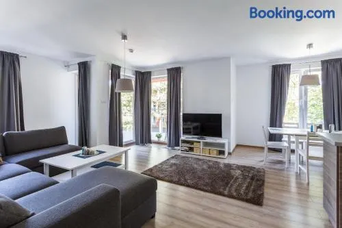 Modern apartment with sauna, seasonal outdoor pool, and fitness center in Kolobrzeg, just 2 km from the beach.