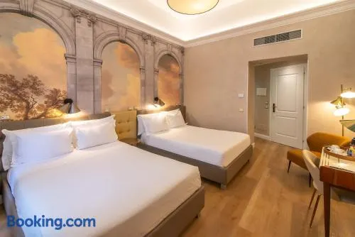 Centrally located hotel in Rome with a rooftop terrace, hot tub, and Italian restaurant, steps from major attractions.
