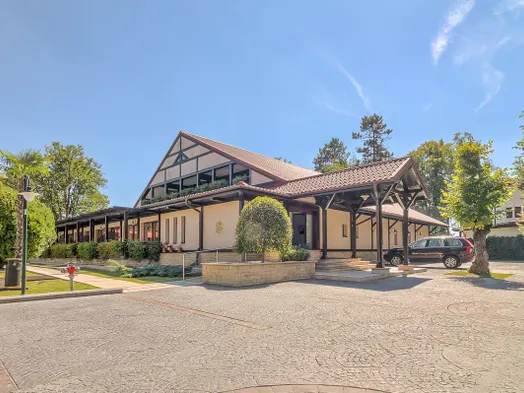 Luxury spa hotel with indoor and outdoor pools, tennis courts, and a restaurant serving international cuisine.