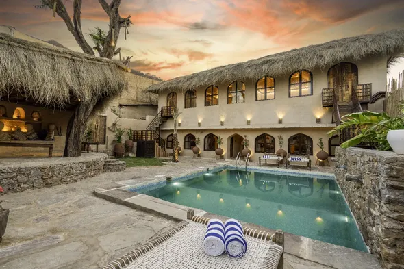 Luxury resort with outdoor pool, spa services, and dining options in Pushkar's historical district.