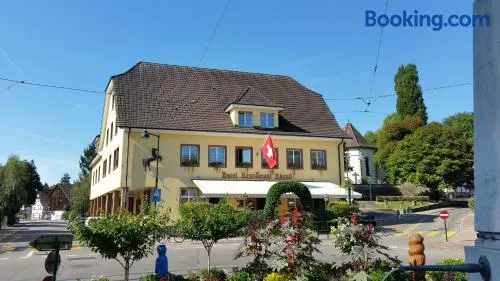 Boutique hotel with a restaurant, terrace, and free parking, located on the riverwalk in Muttenz, Switzerland.
