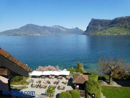 Experience luxury at this beach hotel with a full-service spa, private beach, and stunning lake views in Lucerne.