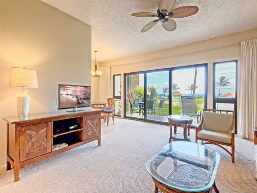 Gorgeous apartment on Kauai's beach with 4 swimming pools, spa, and stunning mountain views for a relaxing getaway.